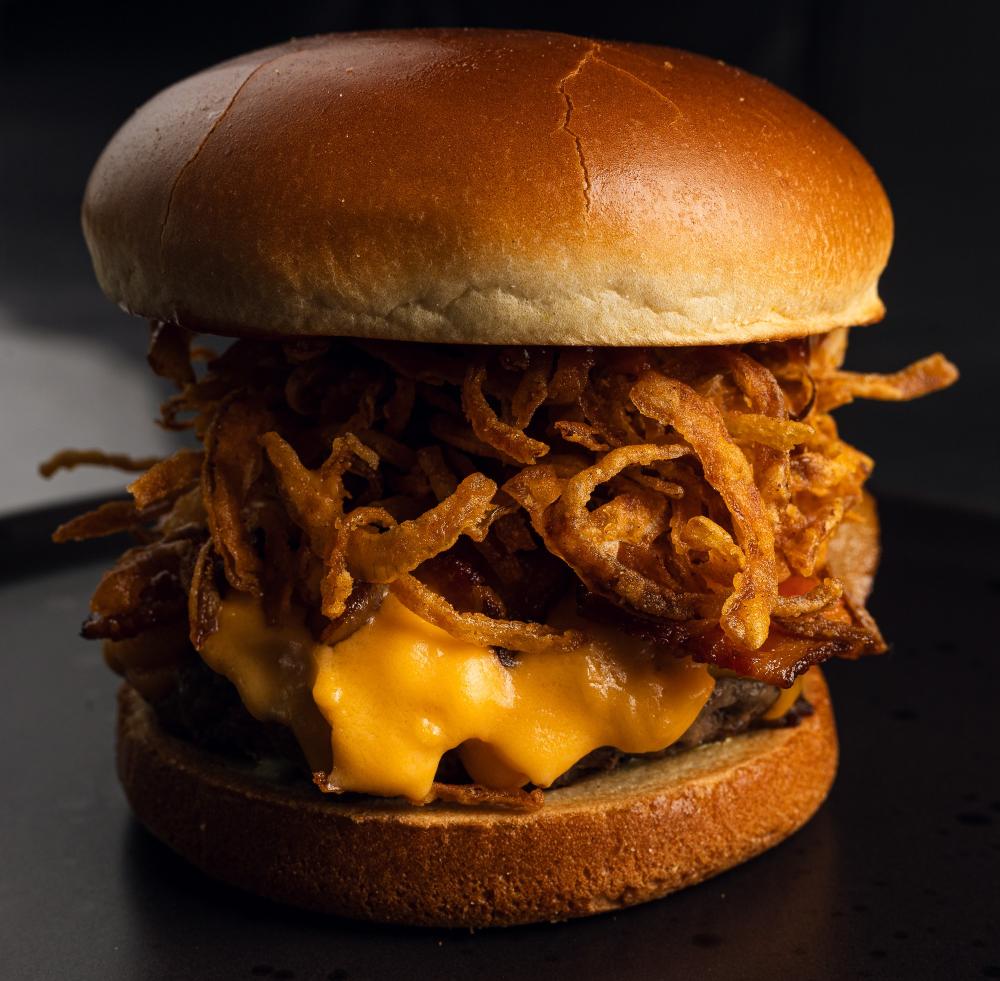 Blend de costela 160g, queijo cheddar, creme cheddar, bacon fatiado, cebola crispy, maionese da casa e molho Space. *Acompanha porção de fritas e maionese da casa.