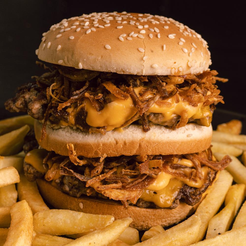 2 Blends de carne 100g, queijo cheddar, creme cheddar, cebola crispy artesanal, maionese da casa e molho Space. *Acompanha porção de fritas e maionese da casa.