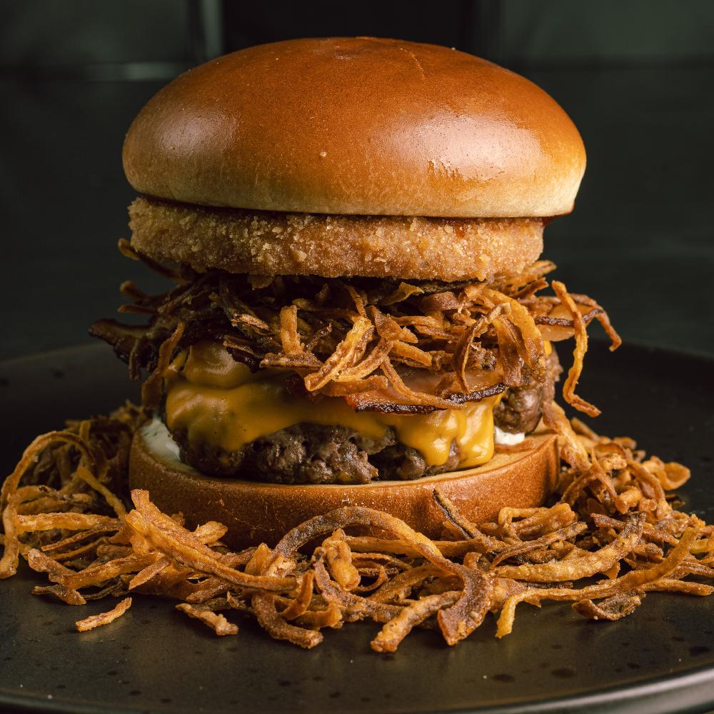 Blend de carne 160g, queijo cheddar, creme cheddar, bacon fatiado, queijo mussarela empanado, cebola crispy artesanal, maionese da casa e molho Space. *Acompanha porção de fritas e maionese da casa.