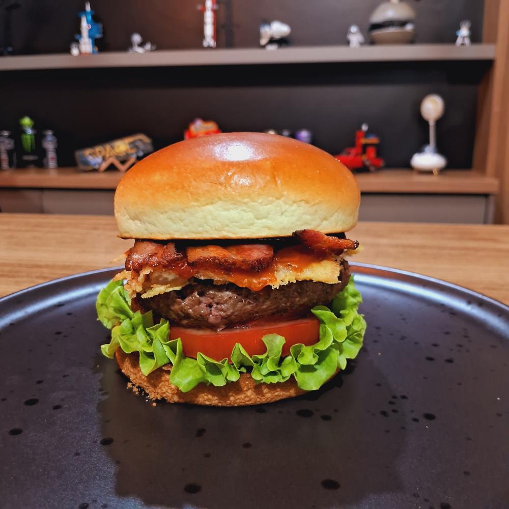 Queijo Brie crocante, goiabada, Molho Sriracha PICANTE, Blend de carne 160g, Bacon em tiras, Alface e tomate, Molho Space, maionese da casa.