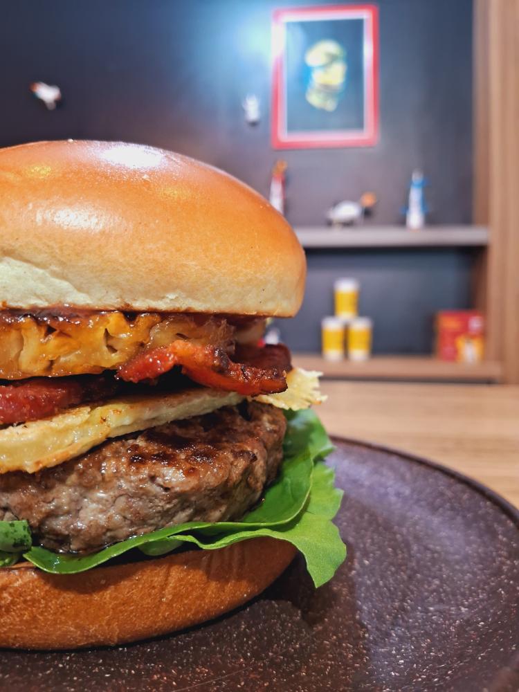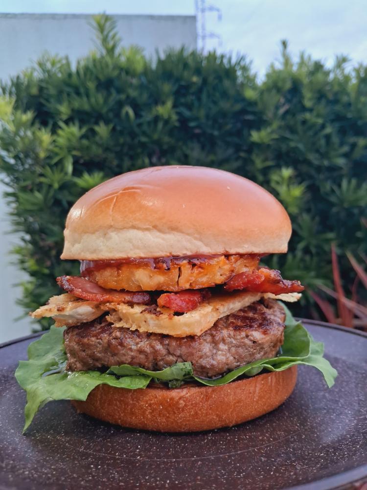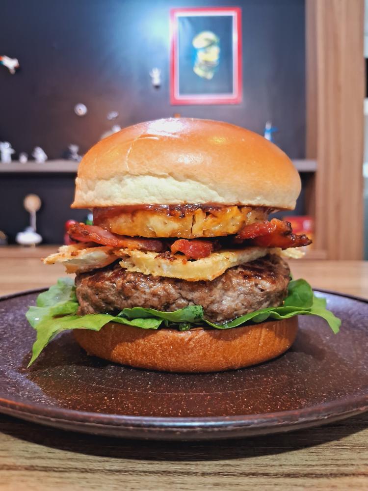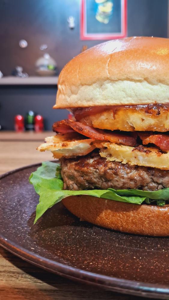 Blend de carne 160g, ABACAXI grelhado ,queijo Brie crocante, Bacon em tiras crocantes, rúcula, Molho Space e maionese da casa. Acompanha porção de batata e maionese da casa.